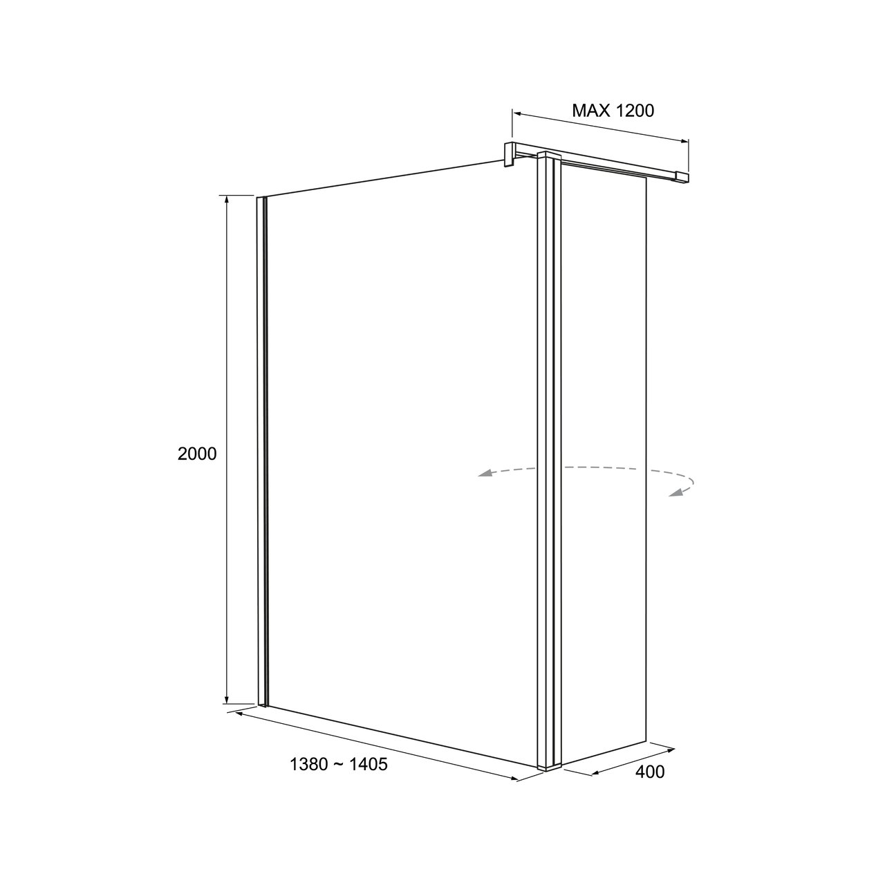 Cette douche à l'italienne mesure 140 cm de long et 200 cm de haut avec un panneau latéral de 40 cm de large. La profondeur maximale est de 120 cm.
