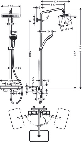 Plage de réglage des points de fixation de la barre de douche | 100 | |
