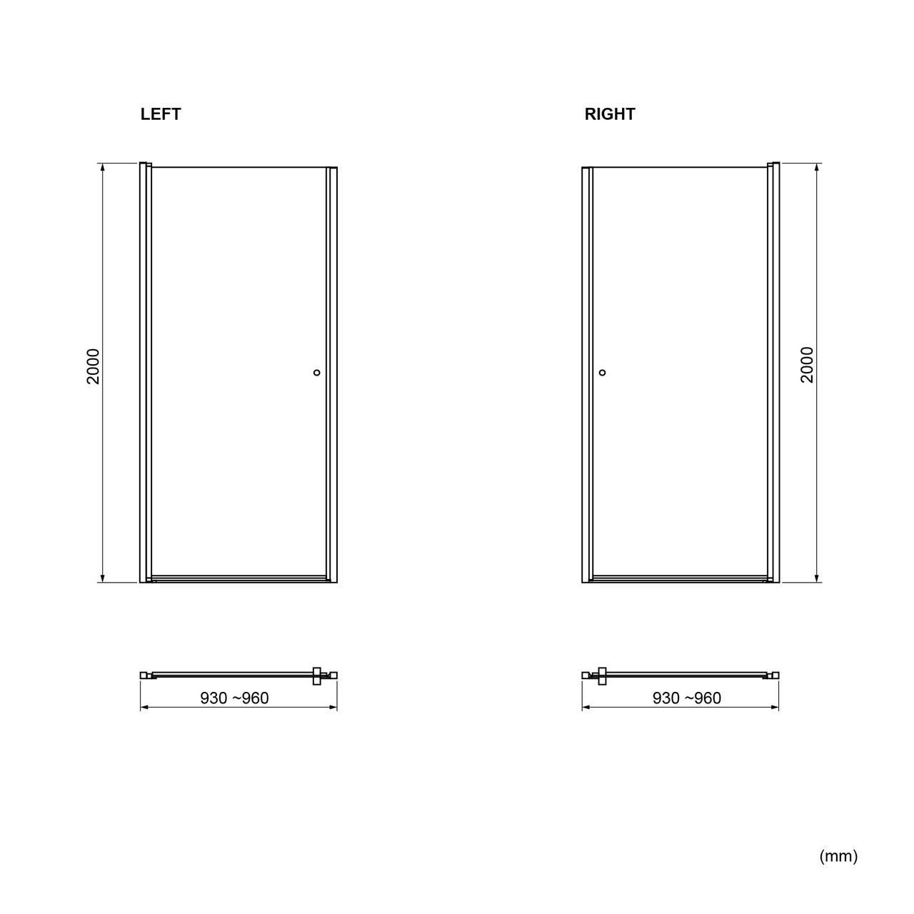 Plage de réglage de la largeur de la porte de douche | 93 - 96 cm | |