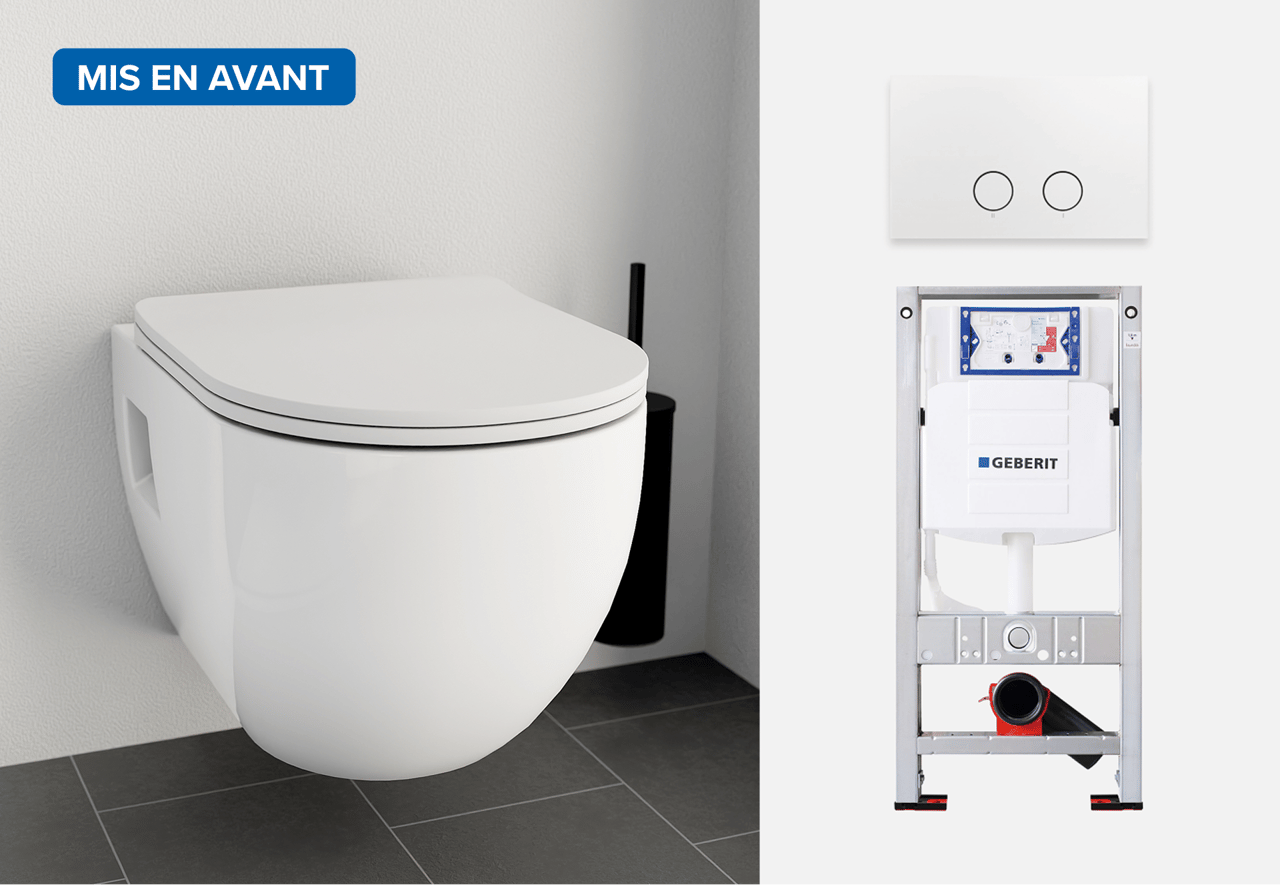 Un pack WC comprend tous les éléments essentiels pour installer ton WC suspendu à un prix ultra avantageux : un bâti-support Geberit UP320, un WC de Linie et une plaque de commande de Luca Varess. Bien sûr, une trousse d'installation pratique est également incluse, pour que tu puisses directement te lancer.