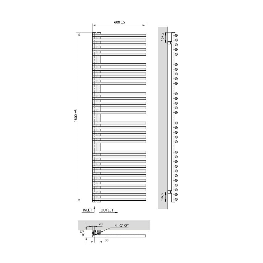 Ce radiateur à tubes ronds possède une largeur de 60 cm et une hauteur de 180 cm.Le radiateur blanc mat s'intègre dans toutes les salles de bains grâce à sa finition élégante.